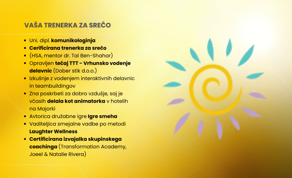 certifikat Happiness Trainer pod mentorstvom prof. dr. Tal Ben-Shaharja, ki je pozitivno psihologijo predaval tudi na Harvardu.